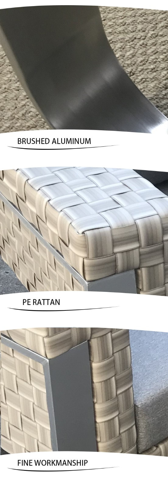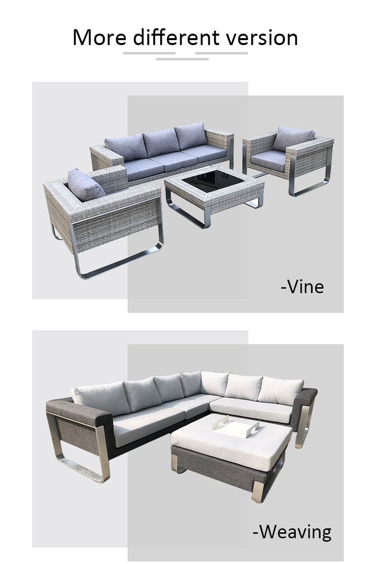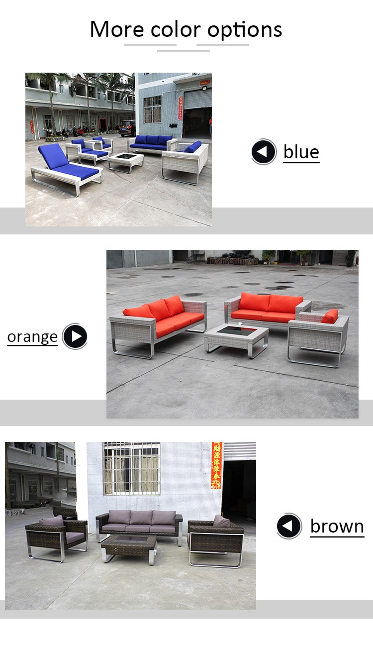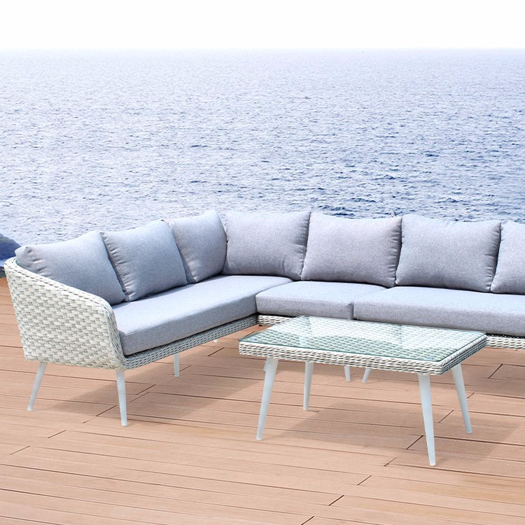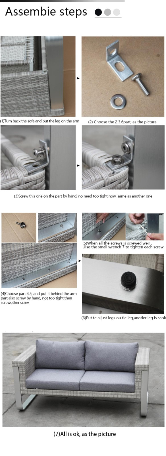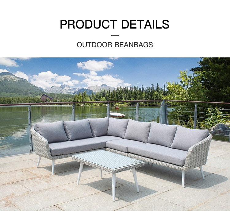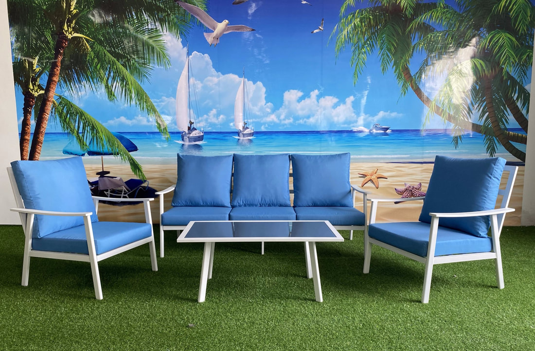 White Aluminum 4-Piece Outdoor Sofa Sets With blue Cushion. 4-piece set includes table, loveseat and two chairs with cushions. Made with durable iron frame and matte black finish. Designed for easy assembly and lasting entertainment